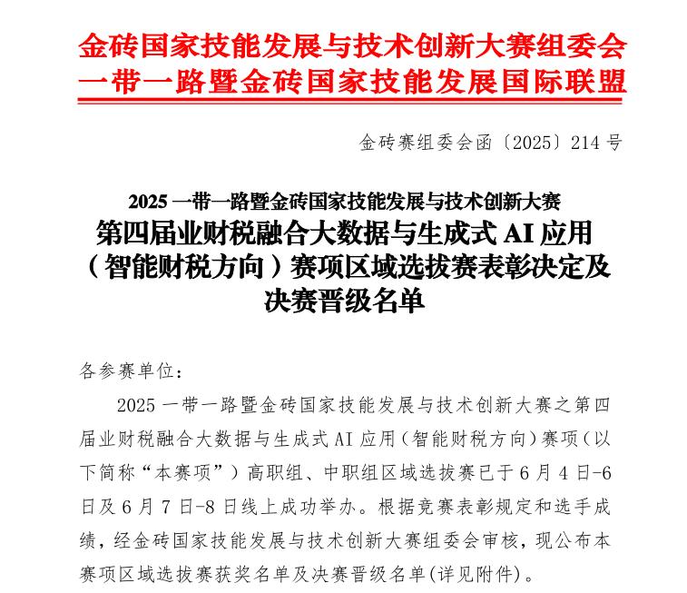 近日,金砖赛组委会公布了2025一带一路暨金砖国家技能发展与创新大赛第四届业财税融合大数据与生成式AI应用(智能财税方向)赛项区域选拔赛获奖名单,我校师生以优异成绩展现职教风采,两个参赛团队均斩获二等奖,四川省盐业学校第1队顺利晋级决赛!