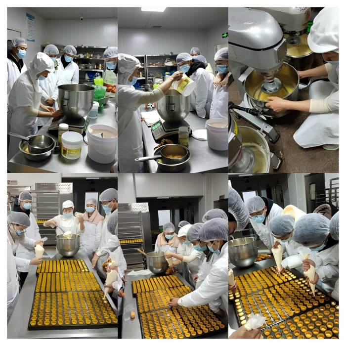 本次实训为贴近企业量产环境,基地从原料、设备、流程三方面精细筹备。原料端按精准称量要求分装低筋面粉、鸡蛋、细砂糖等食材,标注蛋清打发判定标准等关键要点;设备端提前调试大型搅拌机档位与烤箱恒温参数,按生产动线摆放工具;组织上延续“基地技师+学校教师”双师协同模式,实训前通过案例复盘强调批量生产中胚体塌陷、馅料消泡等风险防控,夯实效率与质量意识。